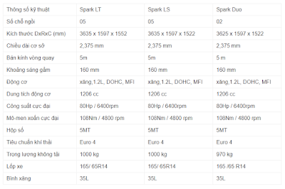 4. Thông số kỹ thuật của Chevrolet Spark 2019